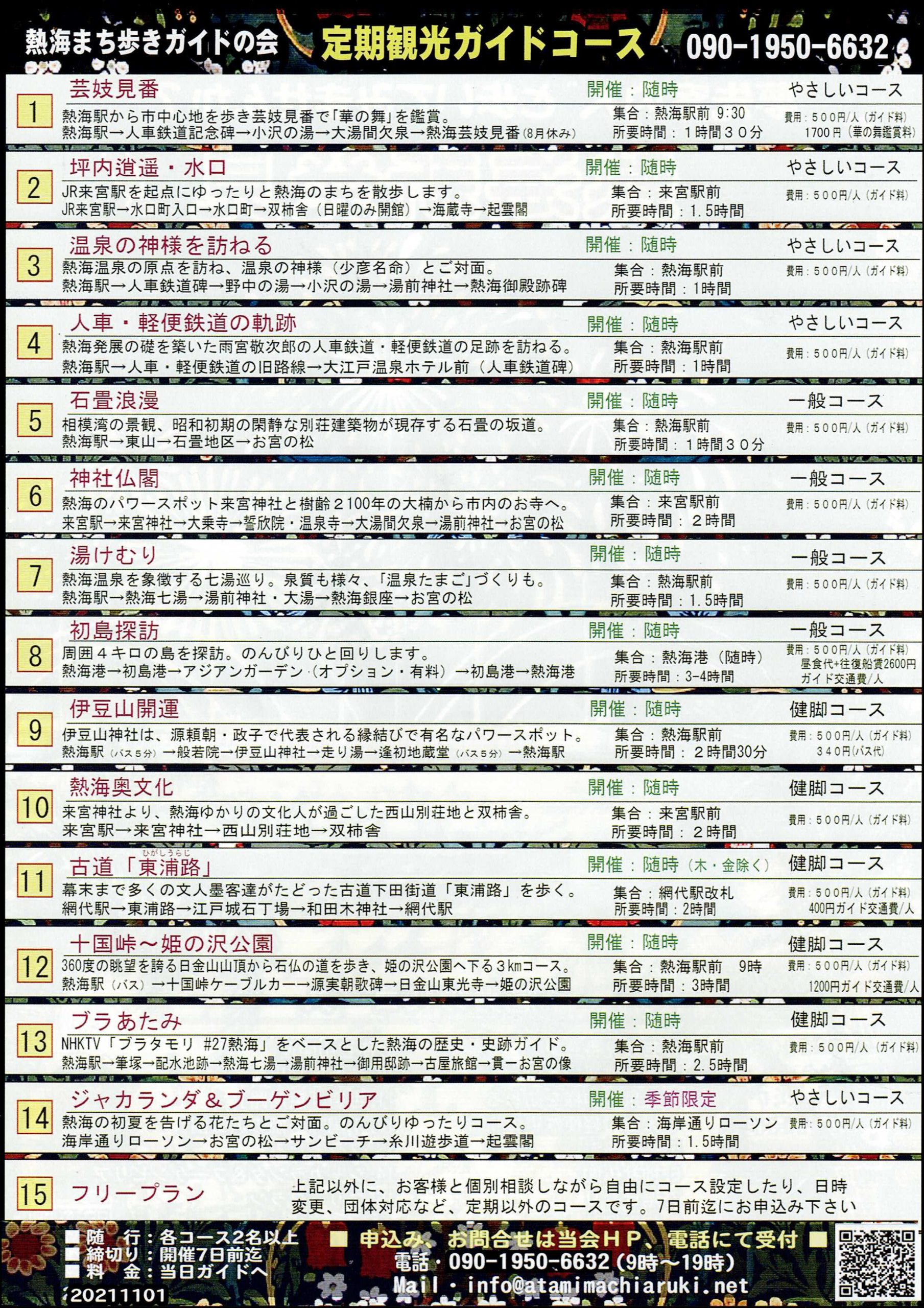 15コースを用意しています。「やさしいコース」「一般コース」「健脚コース」「その他コース」とありますが、一番人気は「湯けむりコース」です。温泉地・熱海は別名「坂のまち」ですが、このコースは起伏がほとんどありません。熱海駅を起点に市街地を歩き、街の風情を楽しんでいただきながら、熱海温泉の原点である”大湯間欠泉”へご案内します。